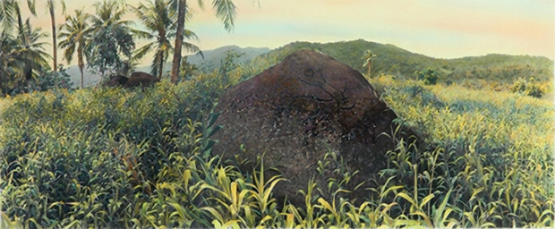 Birth petroglyph and female phallic stone, Ponape, Pacific Ocean.